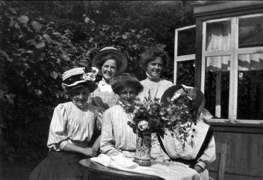 Strömsholm 1910-11. Fem vackra damer utanför värdshuset.