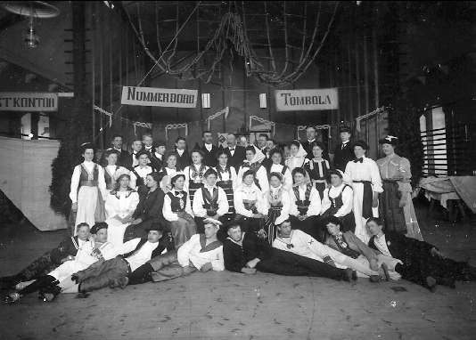 Fästningen, basar i "gamla kyrkan" omkr 1910. Längst bak till vänster om klockan Carl-Gustav Lindqvist (far till Anna-Lisa Blick). Till vänster om honom Helge Karlsson, handlare i Åsen. Klädd i vegamössa Oskar Rosenqvist Teatercafeét. Liggande till höger Bertil Andersson (Justus Anderssons son). Foto: Alfred Sjöberg. Förstoringar 17 x 23 och 2st 27 x 41 cm. Neg finns.
