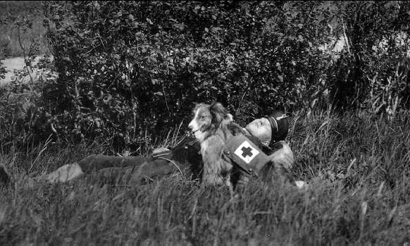 Titel: Trängkåren. Utbildning i sjukvård på Axevalla Hed omkr år 1915. Sanitetshundar. Neg finns.