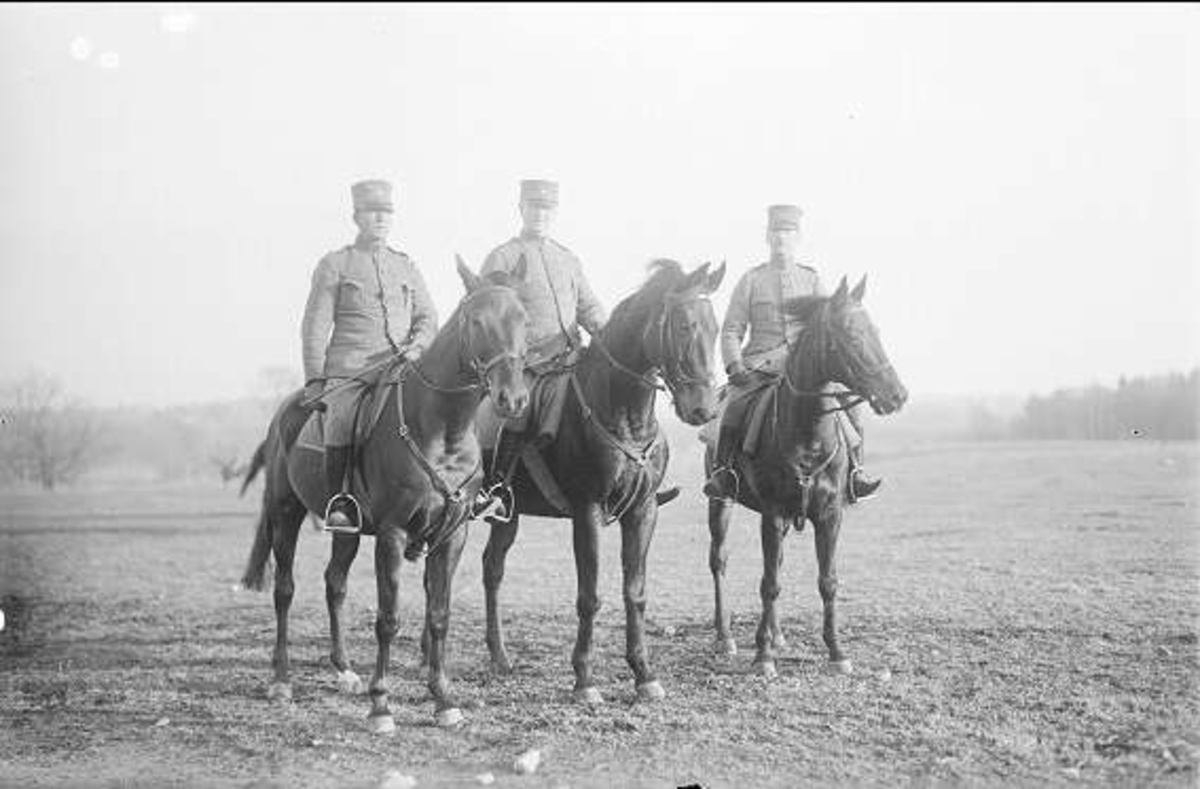 Tre K 3-befäl till häst på fältet öster ridhuset. Klädsel m/23. I bakgrunden Dunkehallsåsen.