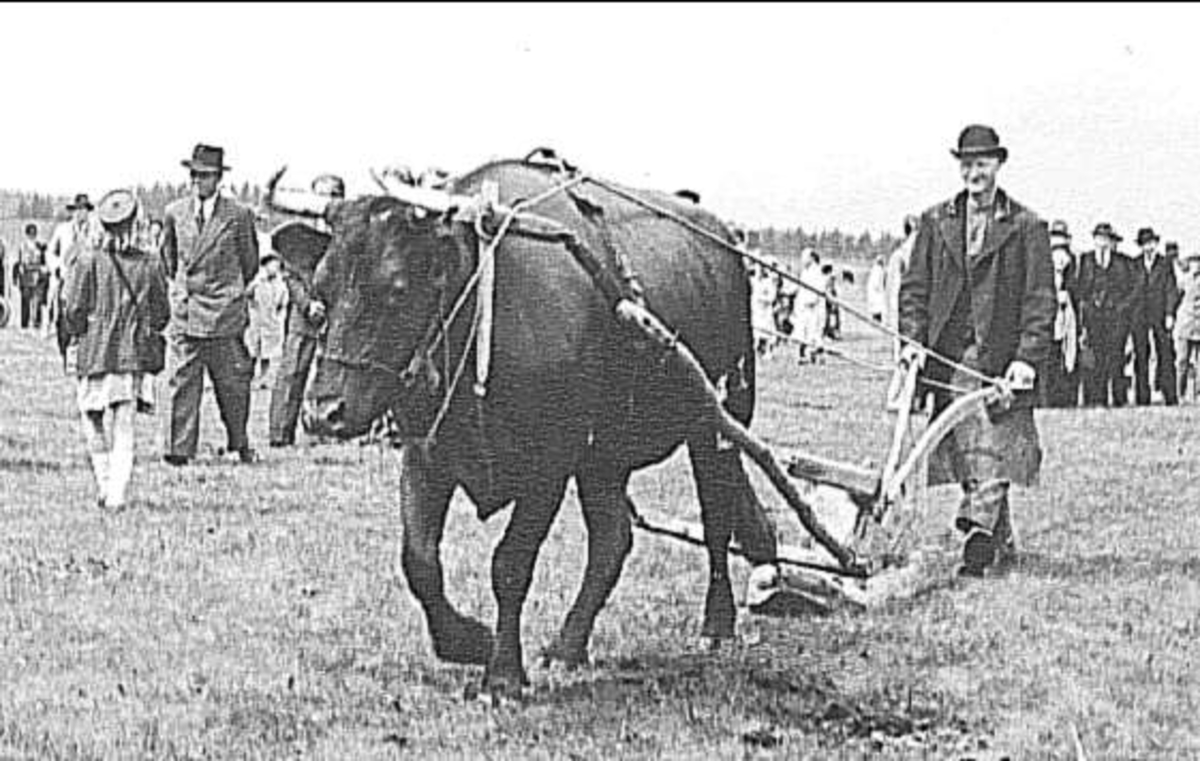 Den mycket kända oxen Rosenbroken körd av sin ägare Arne Johansson, Forsvik.