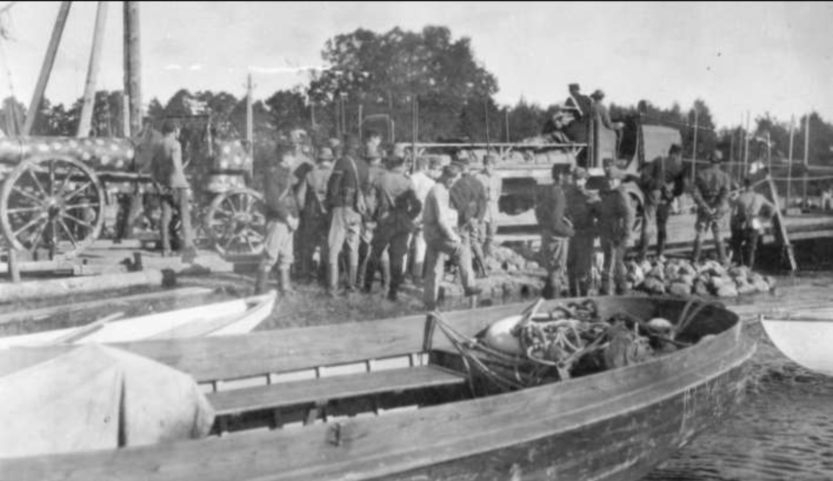 A 10 Karlsborg, överskeppningsövningar med 21 cm haubits m/1917. Längst till vänster en eldrörsvagn och till höger lastbilen.
