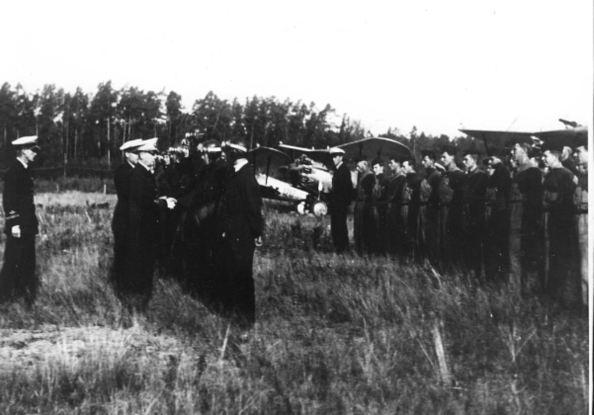 Karlsborg 1934. Chefen flygvapnet, general Torsten Friis vid en inspektion. Flygplan Bristol Bulldog J7 i bakgrunden.