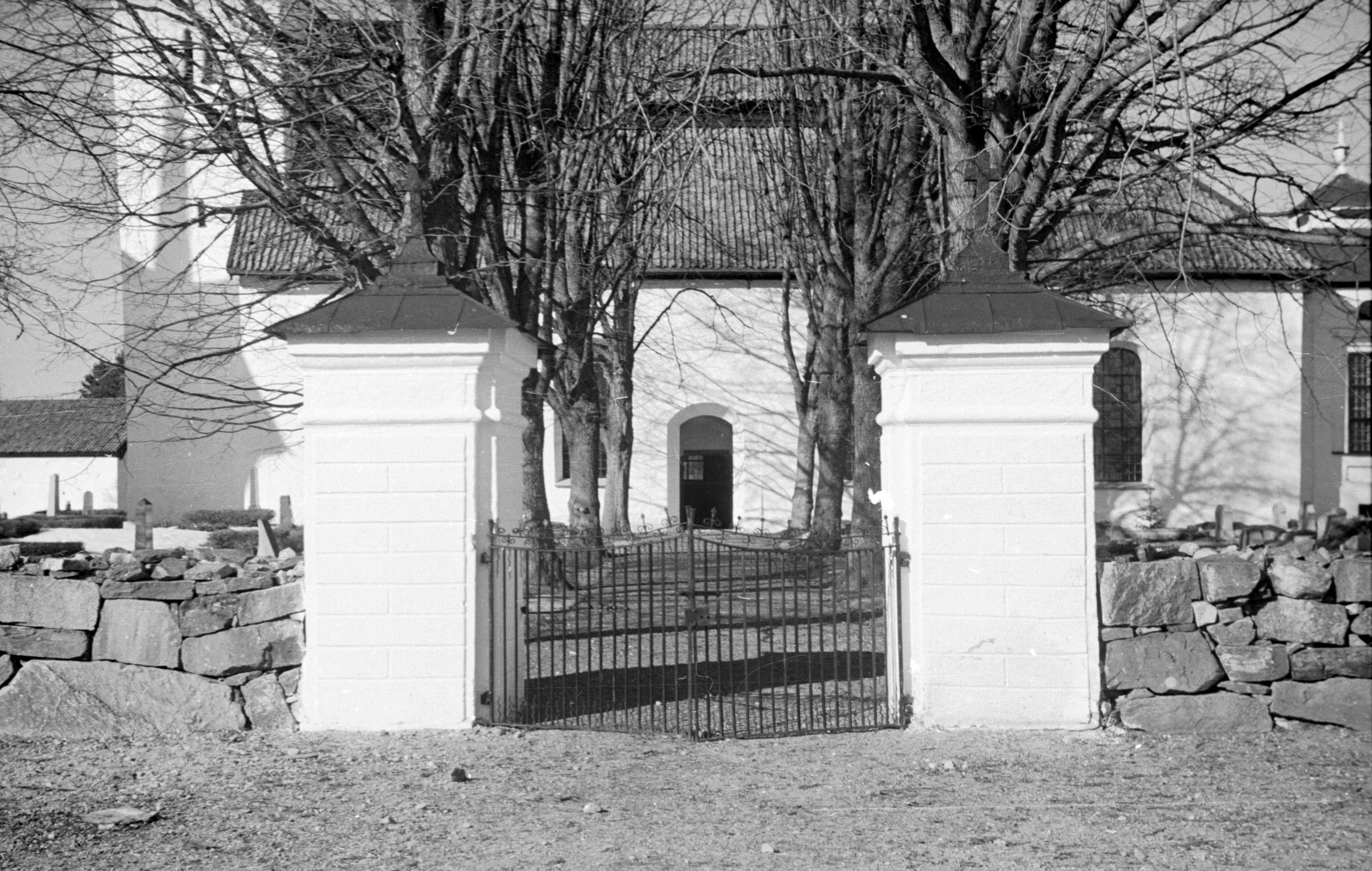 Kyrkan från söder med kyrkgrinden i förgrunden.