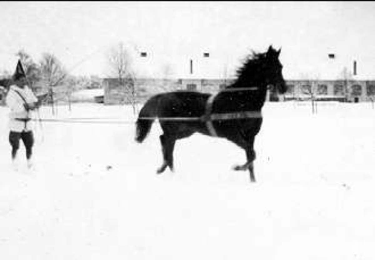 På skidor efter tjänstehästen. En svår konst. Även den bemästrade "Meche". Melker Wernstedt, officer vid K 3 1932 - 1940.