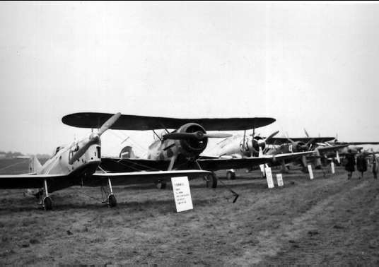 Flygvapenmuseets flygplan utställda vid en flygdag på F 3 1930. Synliga från vänster, P1 Sparman S1 - A, J8 Gloster gladiator, J29 B Saab 29 "Tunnan", J11 Fiat CR 42, S1 7 B, Saab L10.
