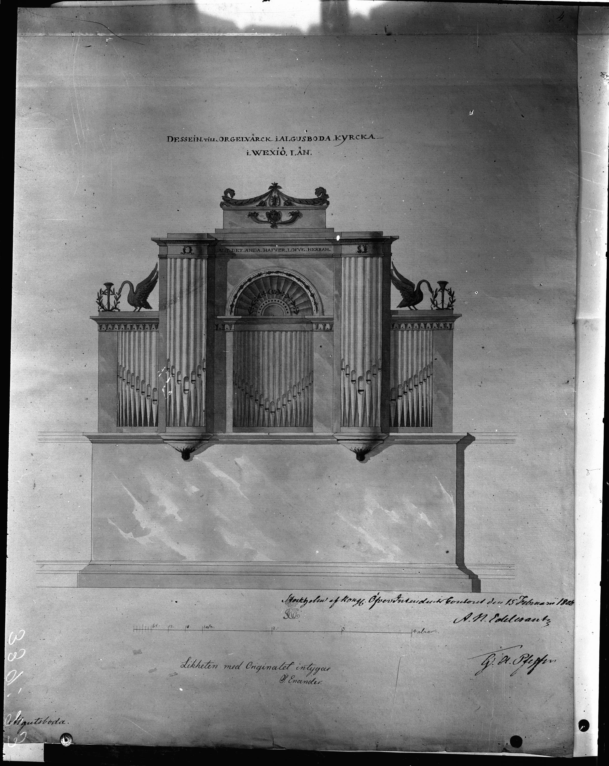 Foto av ritning i Kungliga Byggnadsstyrelsens arkiv, orgelfasad.