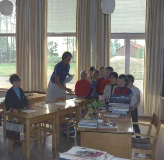 Interiör från en skolsal i Södra Skogens skola 1965. Lärare: Gertrud Dahl. Endast neg finns.