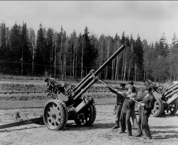 Bofors 1930-talet. 7,5 cm luftvärnskanon m/30, klar för leverans till A 9 Karlsborg. Fotot finns uppsatt i fästningssalen.
