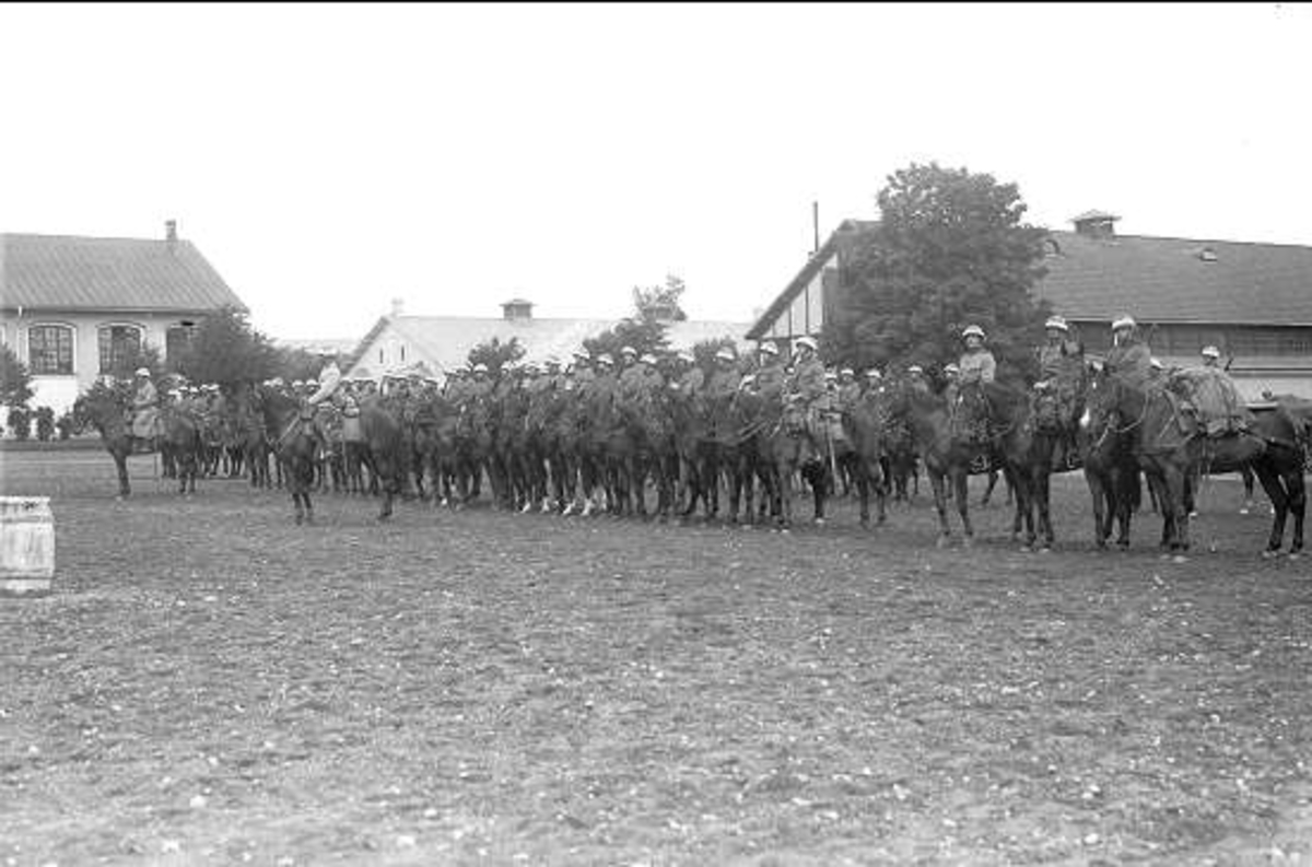 Livskvadron till häst uppställd på kaserngården söder om stallarna för avlämning före fälttjänstövning 1930. Avbildad trupp skall ingå i övningens B-styrka, de har vitt band runt hjälmen. Obs! pionjärpackhäst längst till höger.