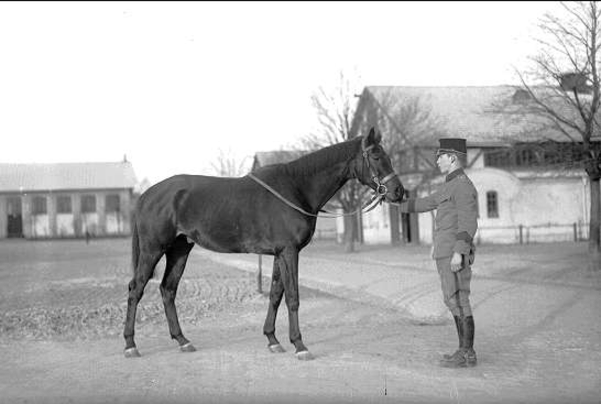 Livhusar (hästskötare) med officers tjänstehäst, söder om skvadronstallarna.
