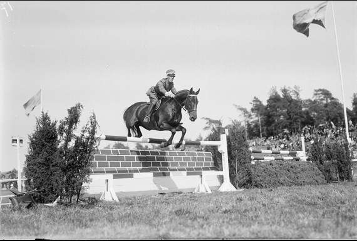 Skövde fältrittklubbs vårtävlingar 1938. Prishoppning på prishoppningsbanan öster kasern. I bakgrunden Dunkehallsåsen - en utmärkt plats för åskådare.