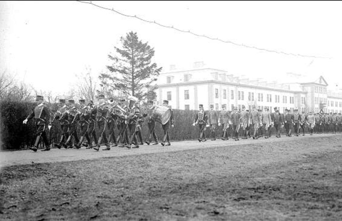 Musikkåren och bakom den officersaspirantskolan i Skövde 1929-1930. Marsch till korum i soldathemmet 4:de dec. 1929.