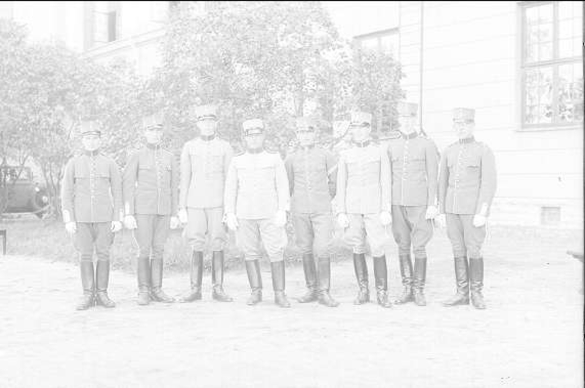 Serg. C E Hasselgren K 4 Umeå och tvåsterckad furir ur K 4 tillsammans med sex elever i uniform m/ä. Serg. Hasselgren och två elever i privat uniform, furiren och fyra elever i kronans uniform. Ang. färgskillnad på uniformerna se bild 2997. Gruppbild.