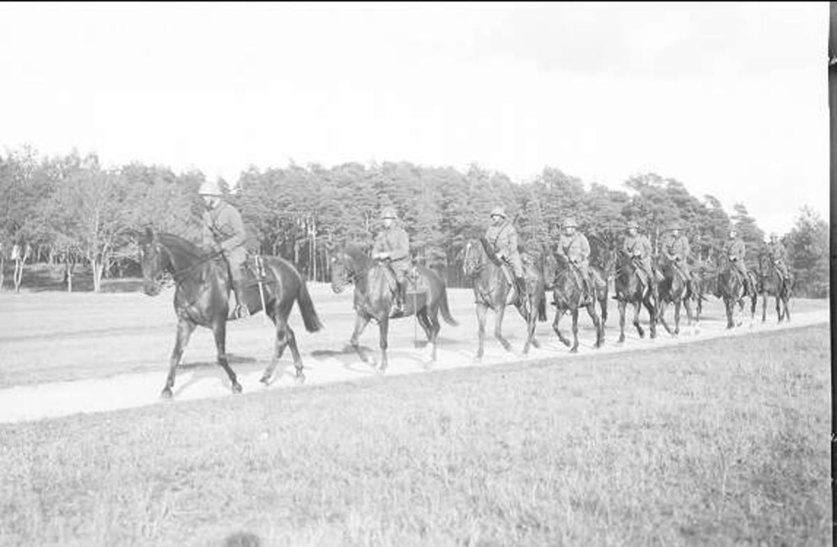 Patrull till häst. 1. man officer i m/23 officerssadel, blå vojlock. 2. man underofficer i m/23, manskapssadel, filt. 3. man furir i m/10 manskapssadel, filt, bakpackning. Därefter fem vpl samma utrustning som furiren.