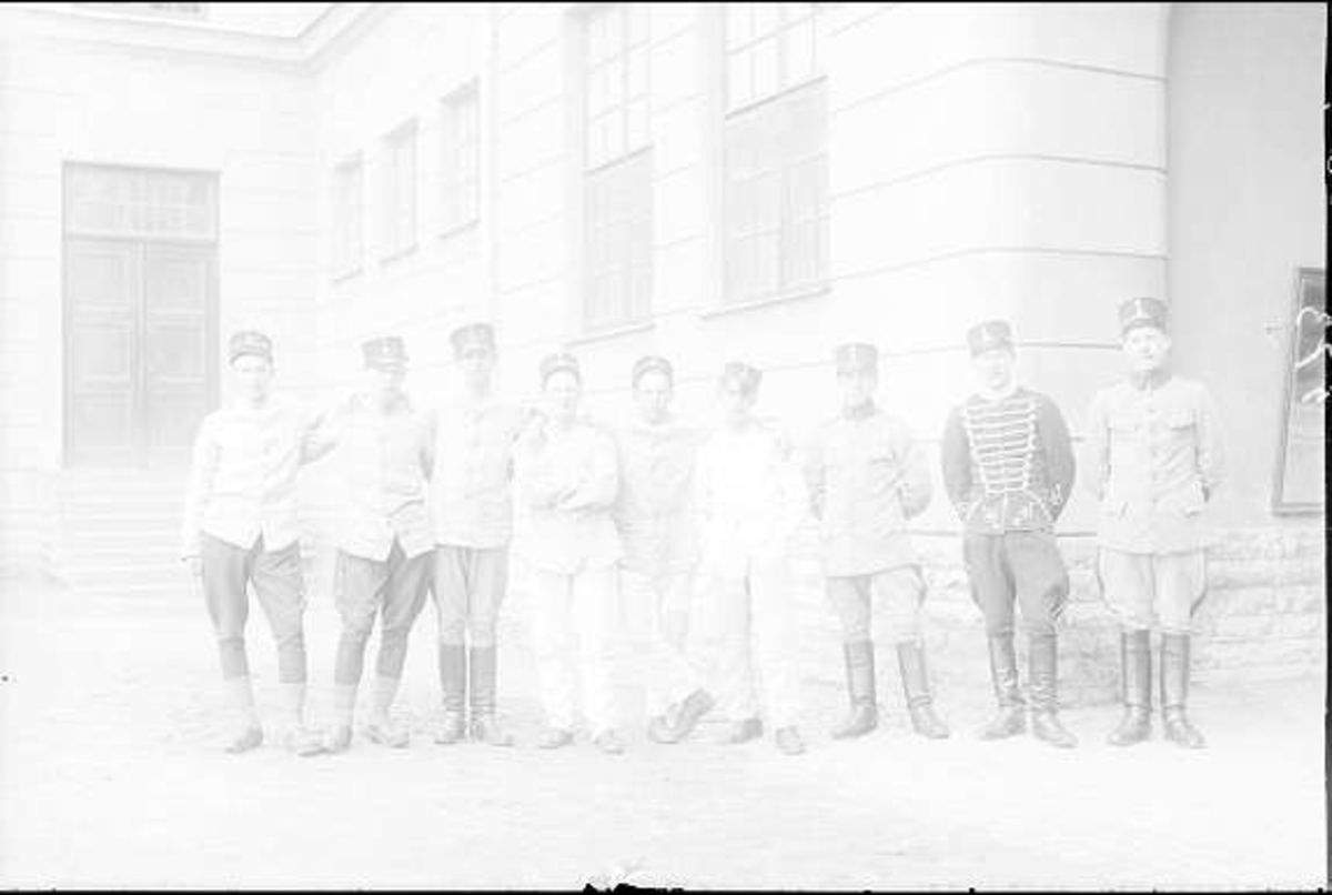 "Rast-vila" i högst olika klädsel. Från höger; 1) uniform m/10, mössa m/ä, benläder. 2) uniform m/ä, mössa m/ä, stövlar. 3) uniform m/10, mössa m/ä, benläder. 4-6) linnekläder, mössa m/ä. 7) linnerock, byxor m/10, mössa m/ä, stövlar. 8-9) linnerock m/ä, mössa m/ä, trätofflor.