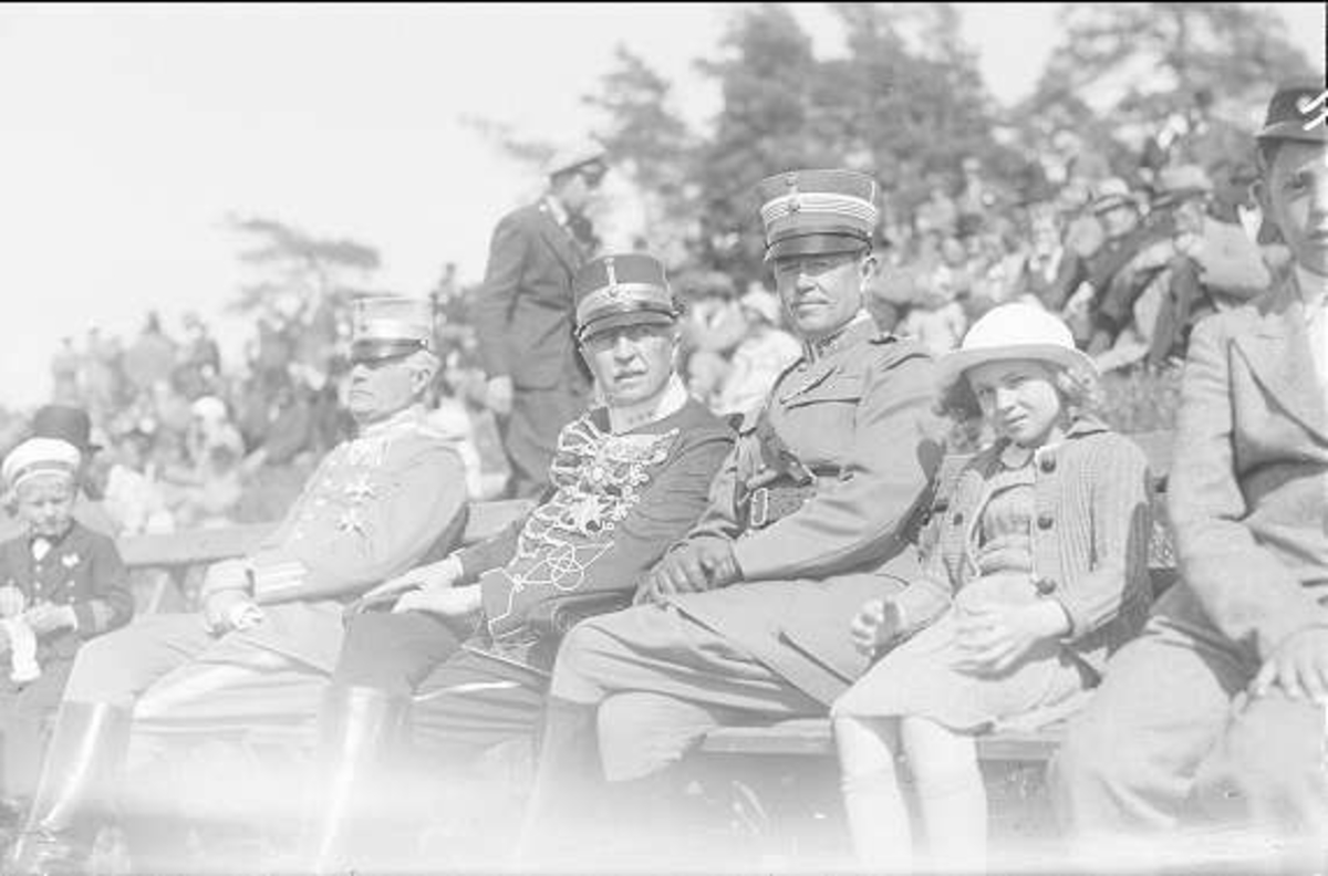 Åskådarna samlade på Dunkehallsåsen för att åse förevisningar av olika slag på prishoppningsbanan. Från höger i bild sekundchefen överste K H Palmstierna, hedersöversten prins Eugen och arméfördelningschefen general L Lilliehök.