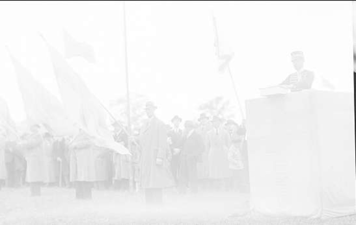 Major Wilhelm Odelberg överlämnar till Göteborgsavdelningen ett av honom skänkt standar, en i vitt siden tillverkad kopia av regementets standar.