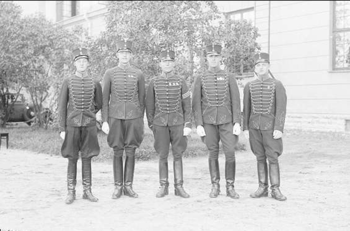 Underbefäl ur K 2 som genomgått armens underofficersskola, (tresterckad furir) tjänstgörande vid aspirantskolan tillsammans med fyra elever från K 2 Häsingborg i uniform m/1895 (m/ä). Till vänster i bild aspirant Ask. Gruppbild.
