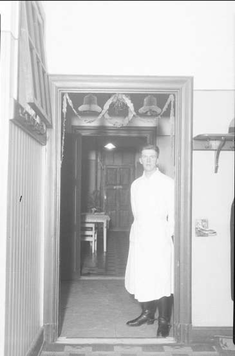 Även sjukavdelningen som var öppen under jul- och nyårshelgerna julpyntades. Här sjukvårdsfuriren som "hälsar välkommen" i dörren till sjukavdelningen.