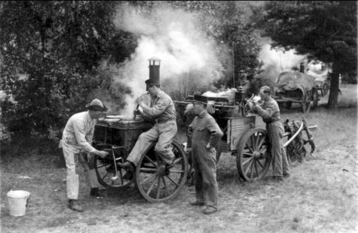 Livskvadrons koktross (hästanspänd) förbereder middagsmålet vid bivackplatsen vid Örlen. Chef koktrossen furir 29/kn Göransson.