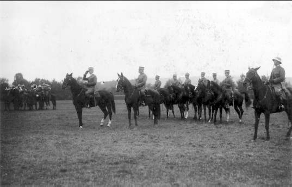 Regementets återkomst från höstmanövern 1934. Förbimarsch för general E Testorp. Överste H Peyron förde regementet. Standarförare löjnt Melcher Wernstedt. Musikkåren under fanj Borgmans ledning. Pukslagare furir Wendel, pukhäst Orkidé E Udiacus-Ischtums.
