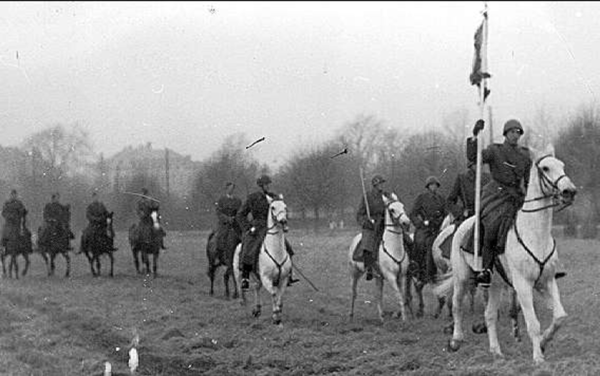 Livhusarernas minnesritt på morgonen 4 december 1946 på fältet vid södra kasernen. Standarförare är Magnus Tornell.