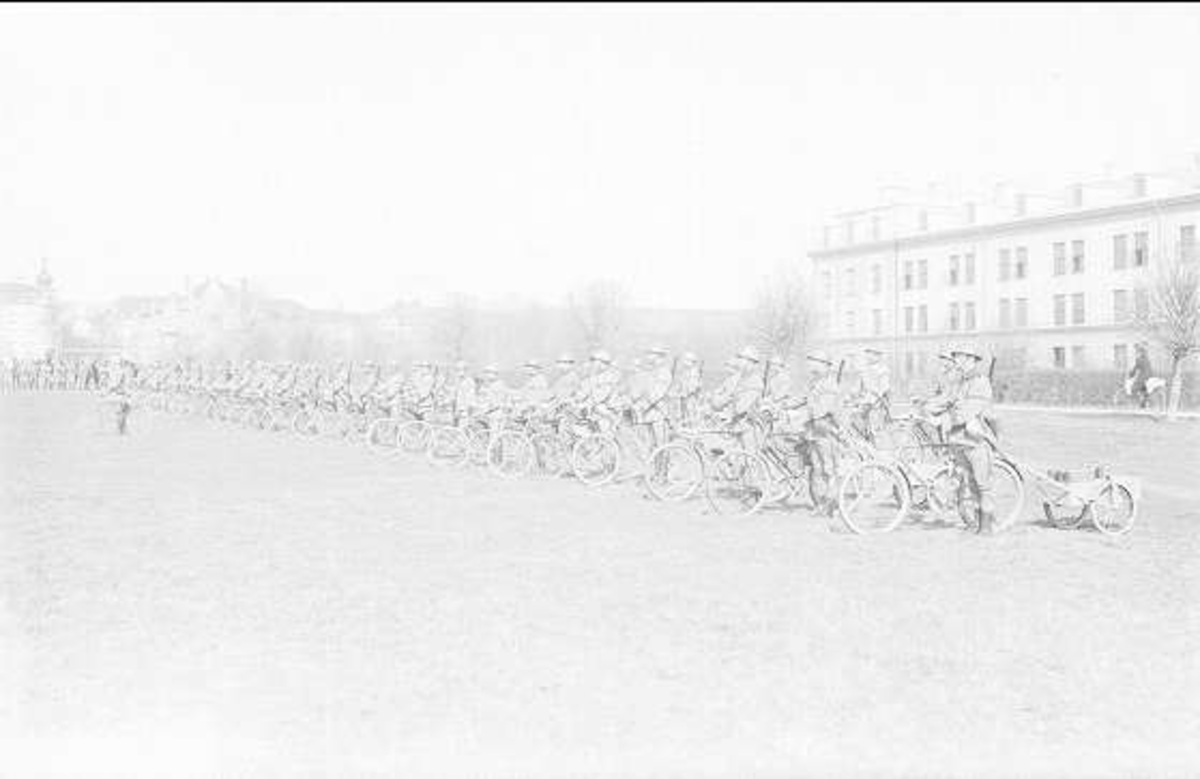 Försök med cykeltrupp. Tunga cykelgrupper med släpkärror för tung materiel.