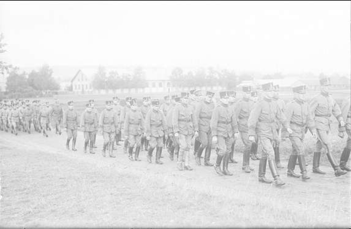 På marsch från kasern till fältgudstjänst i Dunkehall. Soldaterna iklädda uniform m/1910 och mössa m/ä.