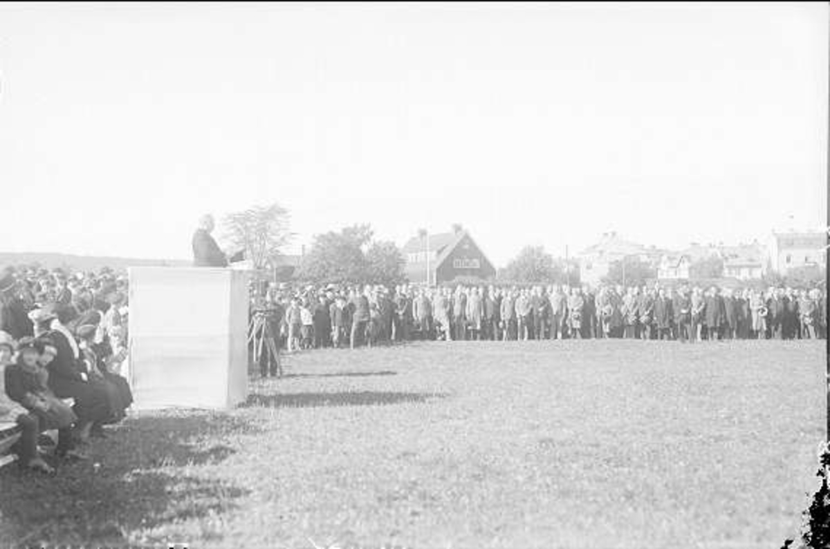 Regementspastorn, hovpredikanten och psalmförfattaren Paulinus Nilsson håller korum för regementet och deltagarna i kamratdagen. Bortom talarstolen musikkåren.