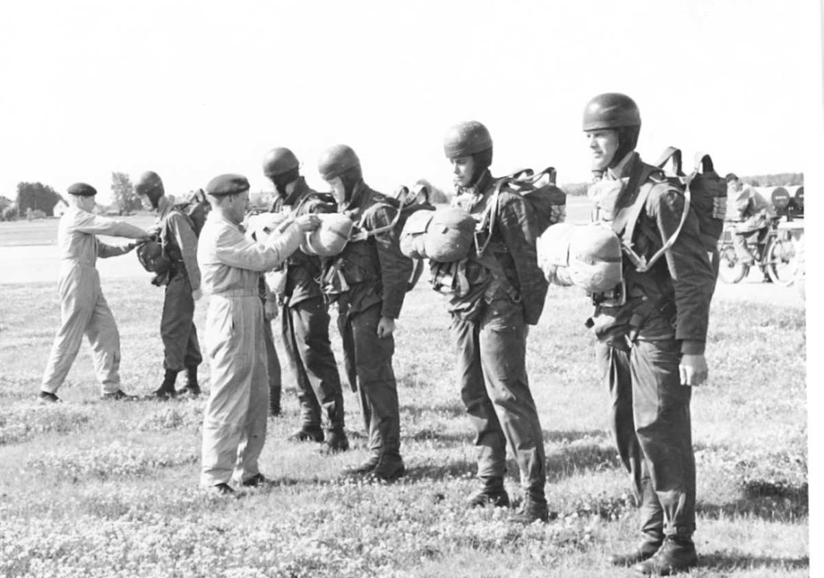 Fallskärmsjägarskolan Karlsborg i början av 1960-tal. Förberedelser inför fallskärmshoppning.