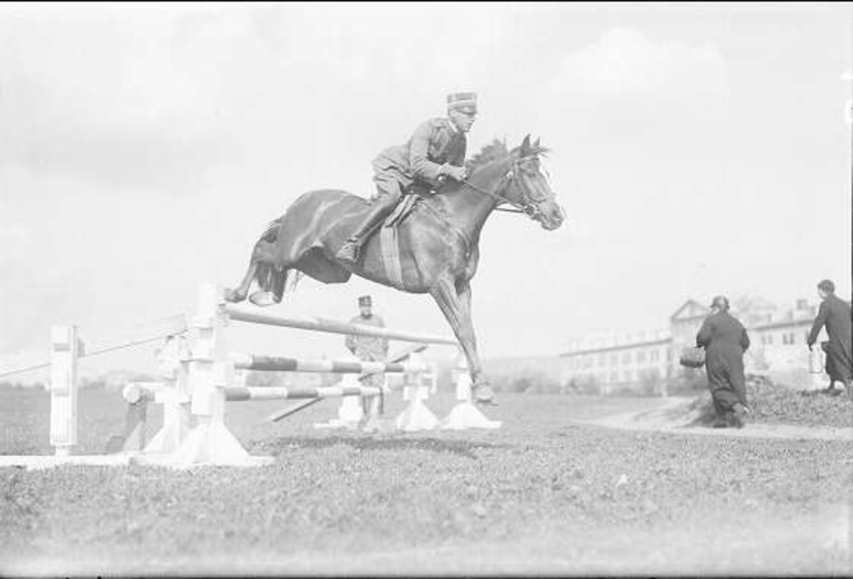 Skolbefäl träningshoppar i samband med aspirantskolans inspektion "damerna" synes fly i panik för " den vilda ryttaren".