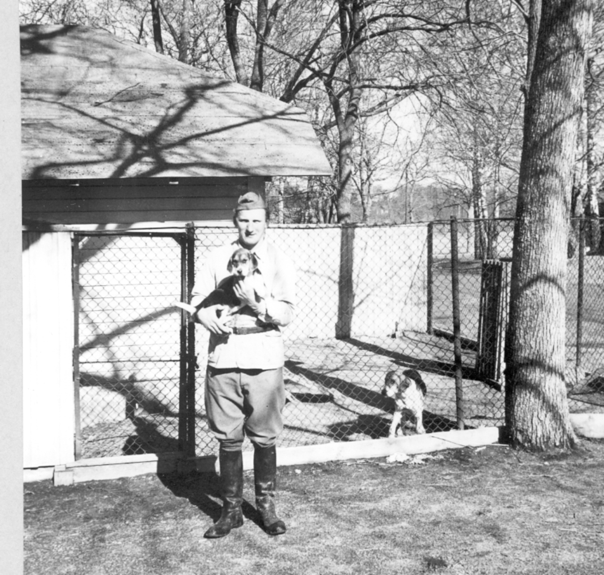 Ridkurs 12/10 1954-13/5 1955 Strömsholm.VPL. Johnsson vid hundgården.Deltagare från Livregementets husarer, K3:Fänrik Westergren, överfurir Fridolfsson och sergeant Ewert Olausson.Förteckning över övriga deltagare finns i albumet.Chef för ridskolan:Överstelöjtnant Gustav Nyblaeus.Förteckning över övriga lärare finns i albumet.Albumet är en donation från Ewert Olausson.