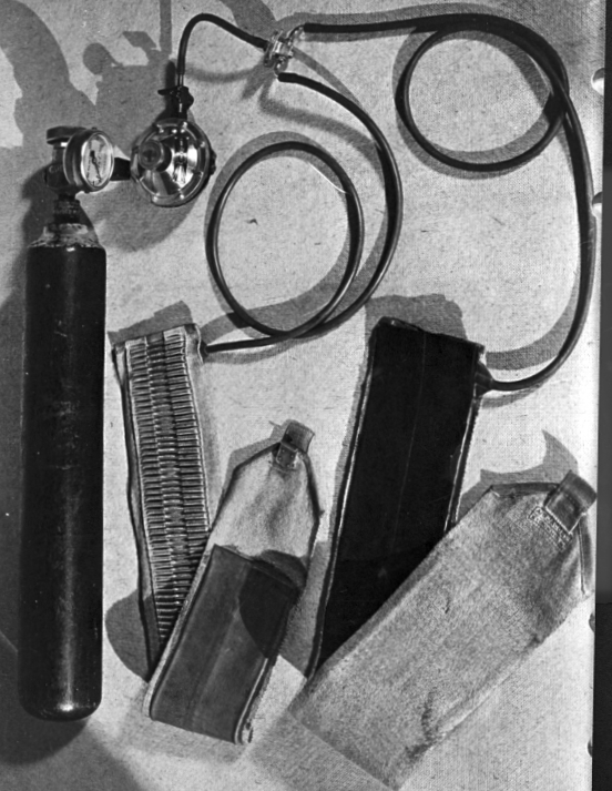 F6 Karlsborg 1943. Försök med kompressionsaggregat för att motverka dykblindhet. En behållare innehållande komprimerad luft. En tryckreduceringsdosa vars tryck kunde varieras upp till 350 mm Hg. Uppblåsningen tog en tid av 2-3 sekunder. Försöken utfördes antingen vid ingången i störtdykningen eller strax innan upptagningen. Albumet är en del av en donation från Karl-Axel Hansson, Karlsborg. Förteckning över hela donationen finns i albumet samt som Word-dokument.