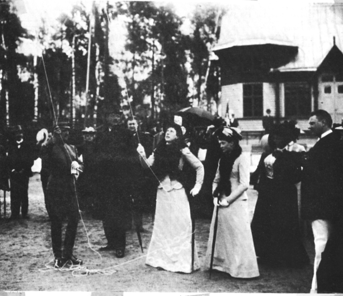 1902. Ballongen "Svenske" döps. Prinsessan Ingeborg förrättar dopet. Hon flankeras från vänster av KABA, prins Karl, prinsessan Tyra av Danmark, änkefru Swedenborg, direktör Hans Fränkel. Dopet skedde i idrottsparken(låg där Östermalms idrottsplats nu ligger).