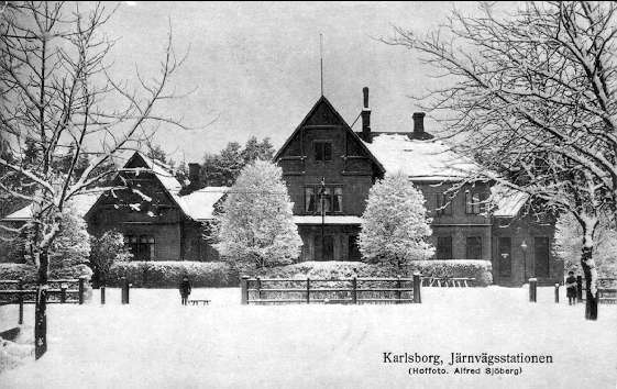 Karlsborg. Järvägsstationen på Storgatan i vinterskrud. Invigd den 26 juli 1876. Vykort. Förstoringar 21 x 29 och 25 x 40 cm finns. Neg finns. Foto: Alfred Sjöberg.