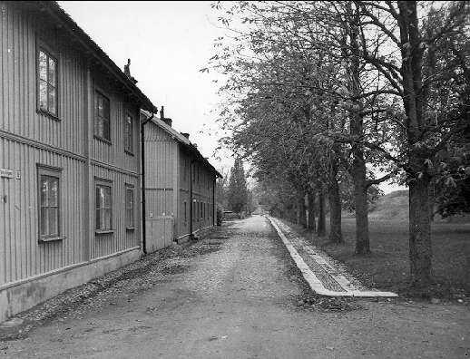 Fästningen, västra Vallgatan med gammal byggnad, eventuellt Karlsborgs äldsta. 1831 flyttades ett bolagshus från Rödesund kan vara denna byggnad.