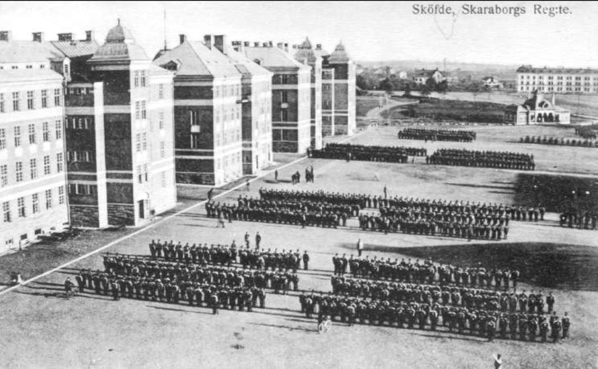 Skaraborgs regemente, Skövde uppställt på kaserngården, öster om kasernbyggnaderna. I bakgrunden (till höger) Livhusarkasernen.