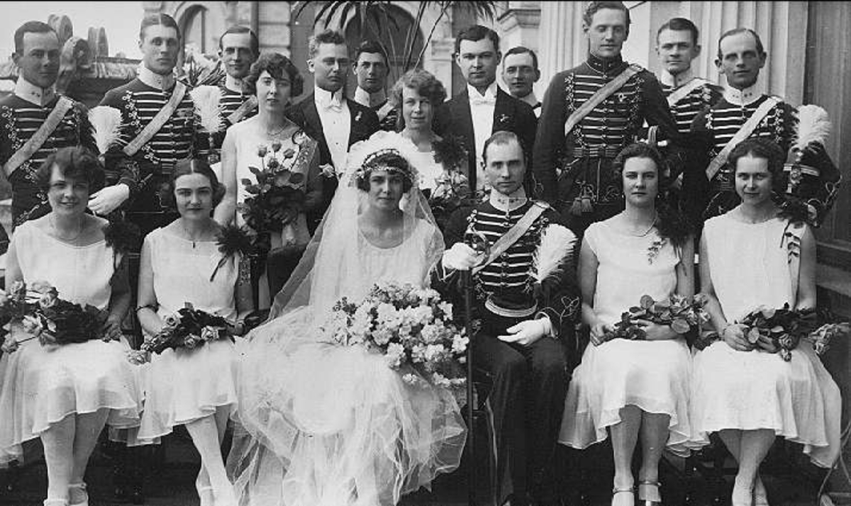 Löjtnant Thord Bondes bröllop 6/4-1926. Bröllopsgäster: stående fr.v: Harald Strömfeldt, Valdemar Swedenborg, Hans Fock, Dagmar Erharth, Doctor Sjöberg, Sven Littorin, Dr Krügers fästmö, Dr krüger, Sven von Essen, Carl Palmstierna (kronprinssens husarer) Carl-Otto Palmstierna, C-E Berthold. Sittande Fr.V: Frk. Nilsson (G.Anell) Frk. B. Berg (senare G.Dr.Sjöberg) Bruden-Brudgummen, Maggie Silfverskiöld, samt en okänd dam.