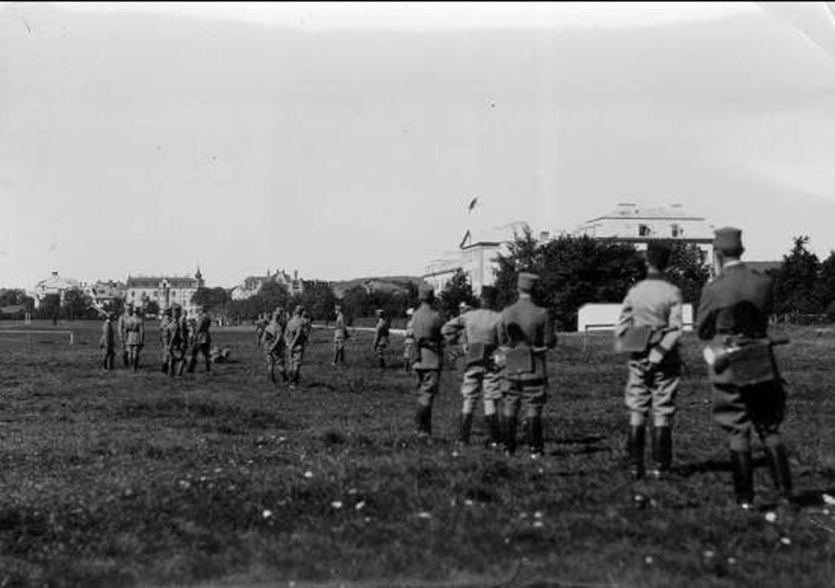 Officersaspirantskolan vid K 3 i Skövde 1929-30. Övningsgenomgång på fältet sydost om kasern. I bakgrunden järnvägsövergången och bortom den "lilla snöplogen" och "stora snöplogen".