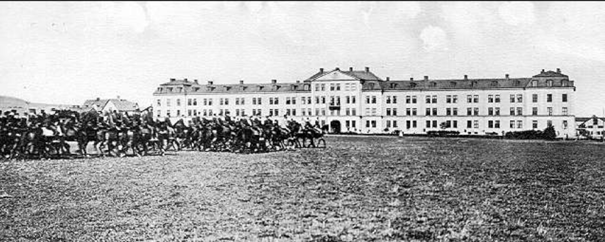 Skövde Livregemetets husarer, kasernbyggnaden från söder. Hemridande tropp på väg mot "östra grinden".