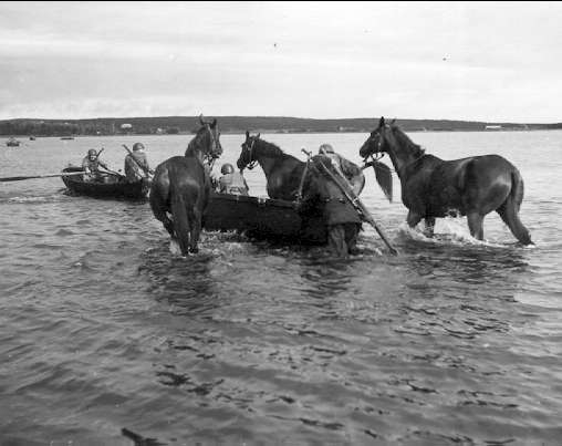 Överskeppning av trupp och hästar med överskeppningsbåt. Fyra man och hästutredning i båten. Fyra hästar simmande runt båten - dragande båten framåt.