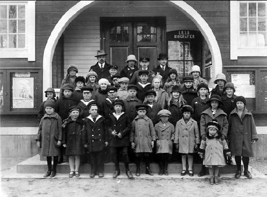 Karlsborg, logen "Vätterns stjärna", ungdomslogen på trappan till Godtemplargården (teaterbio) år 1926. Namnuppgifter finns på bilaga till 53903. Byggnaden revs sommaren 1998.