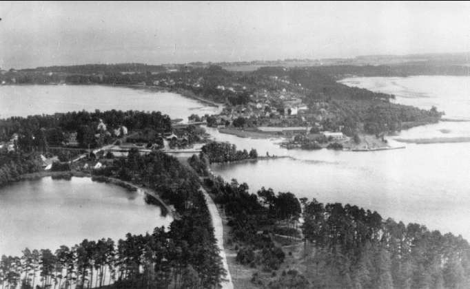 Karlsborg, flygfoto över Kanalholmen och vägen mot Hanken. Gamla vägen från Norra Skogen som numera är cykel- och gångväg. Fotot taget omkr 1935. Kortet är från Karl-Axel Hanssons album.