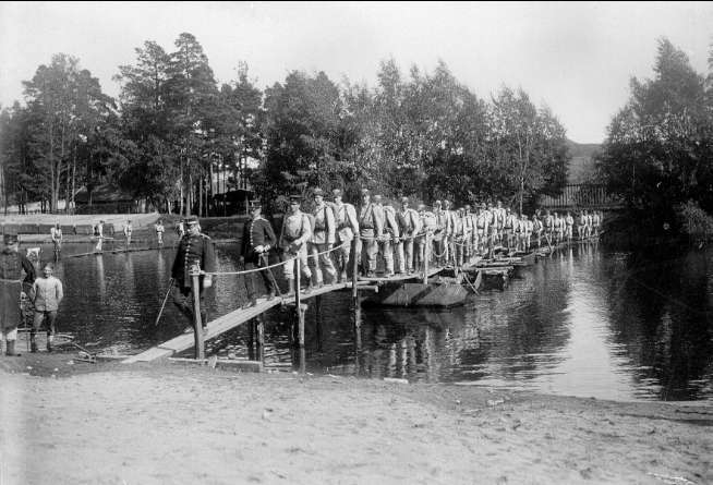 Broslagning. Foto av ingenjörkårens spångbro 1907. Soldaterna bär uniform m/1906. Foto: Alfred Sjöberg, Karlsborg. Fotot skänkt av Dan-Axel Wallerman Södra Kanalgatan 7, Karlsborg.
