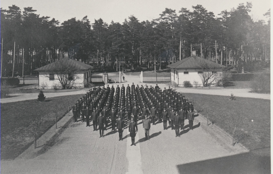 Karlsborg. Infanterivolontärskolan, senare rekrytskolan för infanteriets officers-och reservofficersaspiranter.1920-tal. Till vänster vaktlokalen och till höger arrestlokalen där även ett utrymme fanns för en frisör.