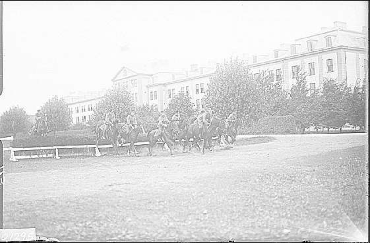 Regementskapplöpningarna 1932 på fältet söder K 3 kasern. Furirjaktloppet över häcken söder östra flygeln. Master löjtn. Sven Littorin.