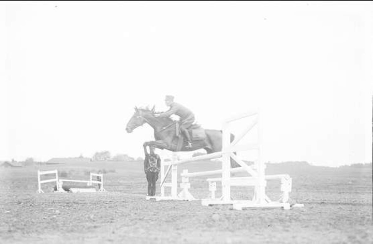 Titel: Banhoppning på fältet söder K 3 kasern off.asp i m/23, vpl i m/1895. De gamla uniformerna användes långt efter det att ny modell fastställts. Modell 1895 användes ända fram till 1940-talet. (exempelvis en volontärskola 1941 på K 2 i Hälsinborg.)