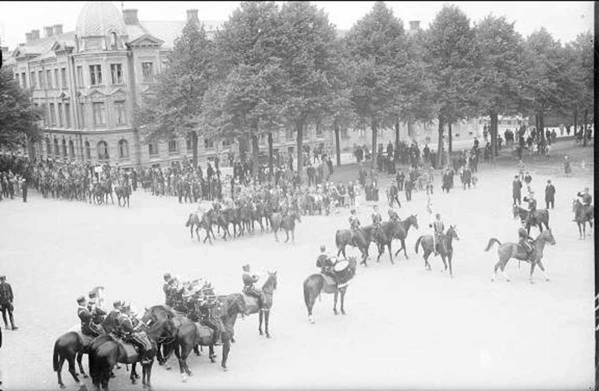 Parad på Gustaf V:s födelsedag 1928. Förbimarsch för platschefen överste Reuterswärd på skolplan framför Eric Ugglas skola. I bakgrunden till vänster milostabsbyggnaden.