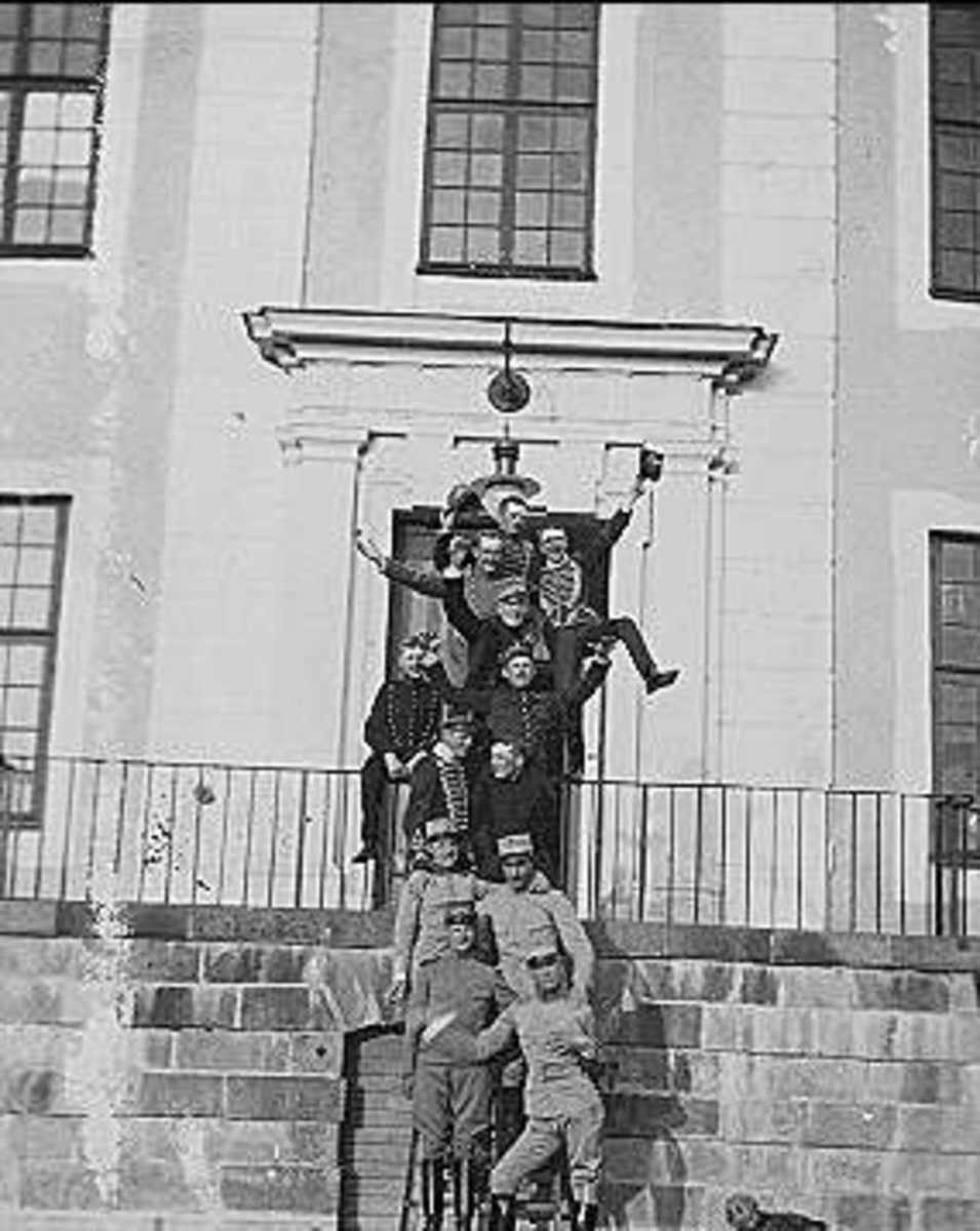 Klubbliv på ridskolan på Strömsholm. Före eller efter middagen? På trappan framför slottet. Ovanför dörren står H E R S, Vilket av alla ridskoleelever uttyddes till: Helvetes "Elegant RidSkola".